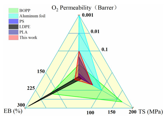 Performance triangle diagram to compare the O2 permeability, TS, and EB of PLA/PVA1/OMMT film with other packaging films. The overall performance of each material is represented by the area of corresponding triangle. The properties of commercial packaging films are taken from the literature: BOPP [34], aluminum foil [35], PS [36,37], LDPE [38,39], and neat PLA [16].