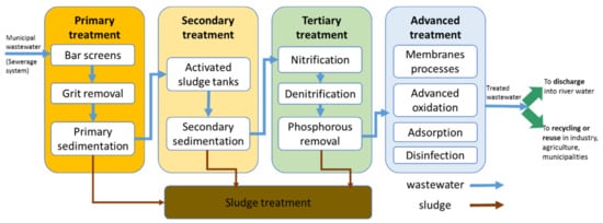 Municipal wastewater treatment outlines for various uses and pollutants removal.