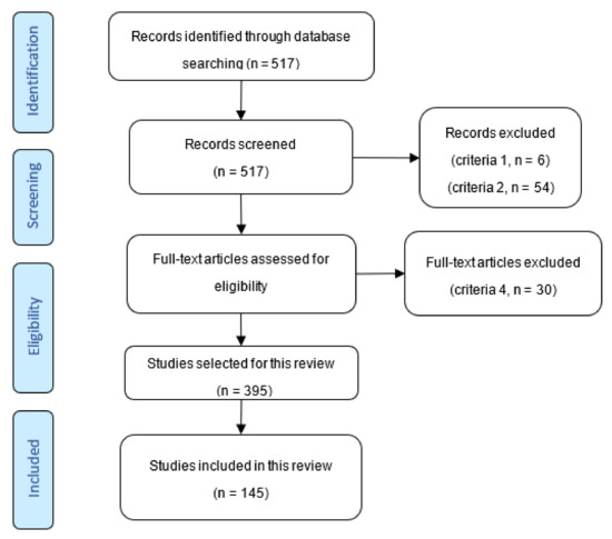 The next selection includes other keywords related to the type of composite polyelectrolytes presented in this research: beads OR core-shell OR gels OR nanofiber OR membranes (criteria 4), only 395 relevant references were analyzed as full content through manual selection. As the reader will notice in Section 3, our manual selection resulted in the inclusion of articles presenting the adsorptive ability of composite polyelectrolytes concerning dyes. The authors decided so in line with the large use of dyes as model pollutant for the organic pollutants category. In addition, only few articles could be found reporting emerging pollutants elimination using composite polyelectrolytes.