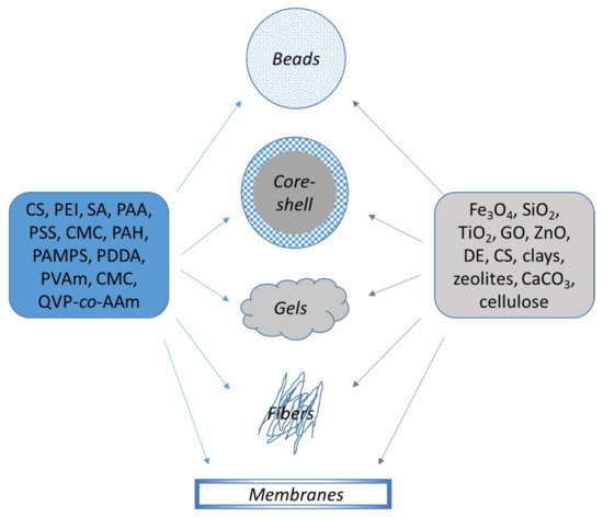 This review brings a clear outlook on the benefits of using different moieties types as active sites of composites based polyelectrolytes for the removal by sorption mechanism of a wide range of toxic, undesired pollutants dissolved in water and wastewaters. The following subsections will be in accordance with the physical state of composite materials, such as beads, core-shells, gels, fibers and membranes, where the chemistry behind each pollutant retention is based only on sorptive mechanisms.