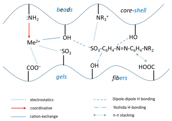 The nature of composite components, the cross-linking density of the synthesized material and the polyelectrolyte architecture significantly influence the sorption properties and kinetics. Thus, after the physical state of composites (shape, size, density, cross-linking degree etc.), the chemical interactions will be the second important parameter that dictates the material capacity for pollutant detection, immobilization, concentration in solid phase and subsequent releasing for a new starting sorption cycle. The sorption process of inorganic (Me2+) or organic pollutants (dyes, pharmaceuticals etc.) are driven mainly by electrostatic interactions, coordinative bonds formation, dipole-dipole or Yoshida H-bonding interactions, and ion exchange interactions. The schematic diagram of all these interactions is presented in Figure 4.
