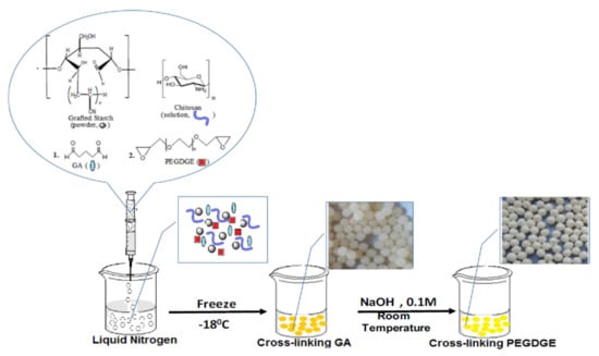 Dragan and Apopei Loghin [53] obtained biosorbents cryobeads from chitosan and starch, using glutaraldehyde and poly(ethylene glycol diglycidyl ether) as dual cross-linkers (Figure 5). It was shown that these composite cryobeads kept their integrity and sorption capacity toward three heavy metal ions (Cu2+, Ni2+ and Co2+) during five sorption/desorption cycles.
