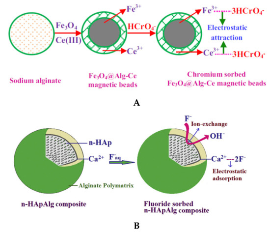 Structure of SA/magnetic (A) (reprinted with permission from ref. [67]) and SA/hydroxyapatite (B) composite beads (reprinted with permission from ref. [66]) and subsequent interaction with pollutants.