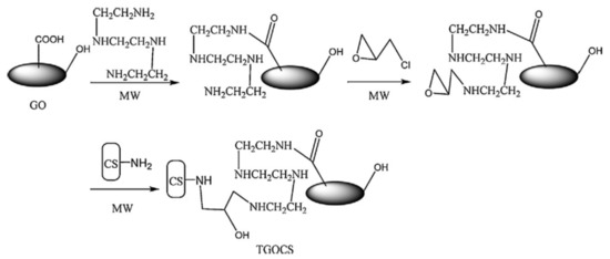 Sometimes, due to harsh environment conditions (extreme pH, high ionic strength, temperature, etc.), which can delaminate the “shell” of composite, the direct grafting of polymeric chains to the solid “core” or “shell” cross-linking after or during deposition, must be carried out. For more stable composites over wide ranges of environment stimuli, many authors anchor polyelectrolyte chains covalently to the inorganic core, which contains a linker molecule on surface [88,100,115]. In this way, the new created core-shell composite is more stable in aqueous media and more effective in sorption of different pollutants. The immobilization of “shell” around the “core” could be achieved by chemical cross-linking with bifunctional compounds, such as glutaraldehyde [89,102,103,109,115], epichlorohydrin [23], α,α’-dichloro-p-xylene [24], phtaldialdehyde [91]. Ge and Ma [23] obtained CS/GO composite microparticles by microwave irradiation method using GO, triethylenetetraamine, ECH and CS (Figure 8). Sorption of Cr(VI) onto composite particles showed high values, reaching 219 mg/g at pH 2. The results obtained by batch experiments showed that sorption capacity of synthesized composite increased with temperature and the sorbent material could be recyclable.