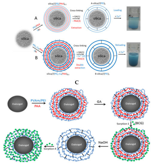 Schematic representation of LbL strategies to obtain silica//(polyelectrolyte)n with high capacities in removal of Cu2+ (A,B) (reprinted with permission from ref. [101]) and dyes (C) (reprinted with permission from ref. [109]) from aqueous systems.