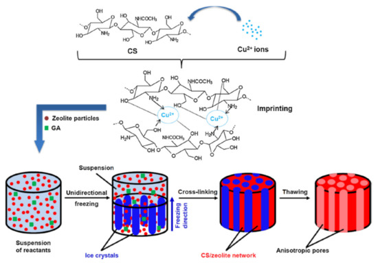 Schematic representation of composite cryogels based on CS and zeolites using a combination of ion-imprinting and freezing methodology (reprintedwith permission from ref. [32]).