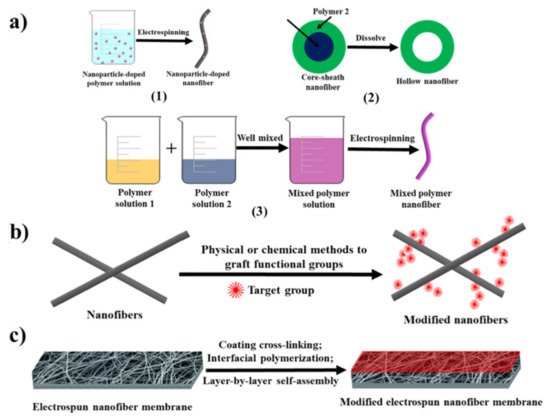 Schematic synthesis of composite nanofibers: (a) electrospinning of inorganic/organic polymer mixture, (b) surface modification of nanofibers and (c) LbL deposited nanofibers (reprinted with permission from ref. [94]).