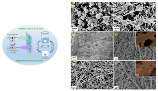 Chen and collaborators [47] functionalized oxidized CS nanofibers in solid state with an antibacterial agent, polyhexamethylene guanidine. In this study it was shown that this composite, with grafted agent, combined the antibacterial (S. aureus and P. aeruginosa) activity with very good sorption for Cu2+ (57 mg/g) and CR (183 mg/g). Bai and co-workers [58] used GO to synthesize composite nanofibers based on modified CS with a quaternary amine. The authors showed the double role of GO: first, the particles enhanced the ability of polycation to form nanofibers and second, they increased the removal capacity by sorption of porcine parvovirus, a non-enveloped virus. The hydrophobicity of GO and high charge density of polyelectrolyte created a composite with 95% retention for the virus. Razzaz et al. [40] used two methods for CS/TiO2 composite nanofibers synthesis: (i) the “coating method”, where electrospun CS nanofibers were dipped in a TiO2 dispersion and (ii) “entrapped method”, where composite nanofibers have been obtained by electrospinning of CS and TiO2 mixture. The chitosan/TiO2 nanofibers prepared by entrapped method have been reused in five consecutive sorption/desorption cycles of Cu2+ (710 mg/g) and Pb2+ (526 mg/g), the support being more selective for Cu2+ in a binary mixture. Composite nanofibers formed from electrospun PS with electrosprayed CS-rectorite (layered silicate) nanospheres on surface, have been synthesized by Tu and co-workers [41]. Also, (PS/CS-rectorite)n composite nanofibers were obtained in a electrospinning-electrospraying alternately deposition approach (Figure 14). In the sorption experiments, the more hydrophylic PS nanofibers coated with CS-rectorite nanospheres showed very good Cu2+ sorption (134 mg/g). The authors improved this value by adding Ca2+ in the composite, due to additive cation exchange mechanism. After three sorption cycles, the nanofibers maintained the sorption ability at ~75%.
