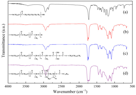 FT-IR spectra of (a) PCL, (b) PCL-b-PLA, (c) PCL-b-PLA-TTC, and (d) PCL-b-PLA-b-PMVK.