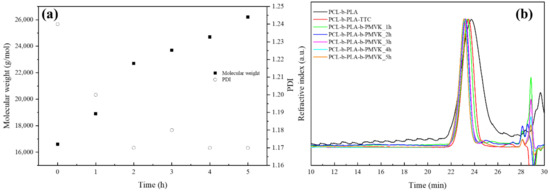 Molecular growth of (a) PCL-b-PLA-b-PMVK, and (b) its GPC diagrams.