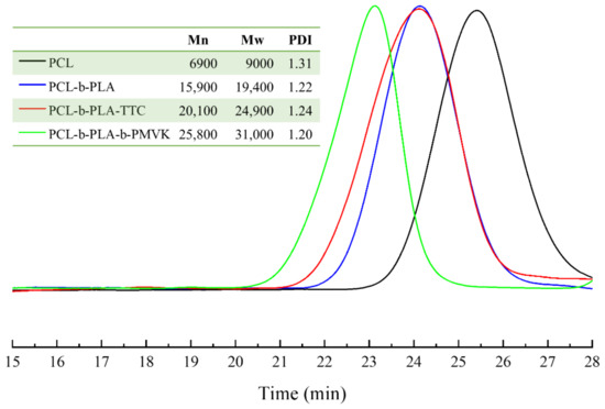 GPC traces of PCL, PCL-b-PLA, PCL-b-PLA-TTC, and PCL-b-PLA-b-PMVK (entry 2 in Table 1).