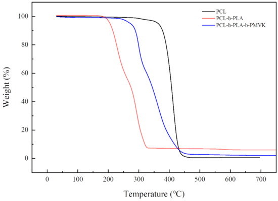 TGA thermogram of PCL, PCL-b-PLA, and the PCL-b-PLA-b-PMVK triblock copolymer.