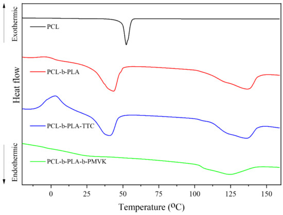 DSC thermogram of PCL, PCL-b-PLA, PCL-b-PLA-TTC, and PCL-b-PLA-b-PMVK.