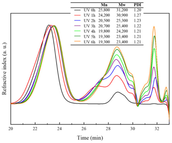 After PCL-b-PLA-b-PMVK triblock copolymers were successfully synthesized via both ring-opening and RAFT polymerization, their photodegradation behavior under UV light at 1700~2000 μm/cm2 was observed after dissolution in THF, and was determined by the decrease in molecular weight obtained from GPC analysis. It is commonly accepted that PMVK can be degraded by two photodegradation mechanisms: radical or non-radical reactions—known as Norrish type I and Norrish type II routes, respectively—and the Norrish type II route is the main one [48]. As shown in Figure 7, the molecular weight of the triblock copolymer decreased with UV irradiation time, reaching that of the macro-CTA PCLA-DDMAT, which means that most of the PMVK block was photodegraded after 6 h of UV irradiation, together with the production of low-molecular-weight degraded residues. These results are consistent with our previous study on the synthesis and photodegradation behaviors of PCL-PMVK block copolymers [35]. GPC analysis also indicated that the amount of photodegraded residues produced, and their molecular weight, decreased with UV irradiation time.