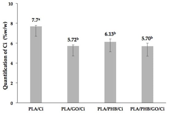 Figure 1 shows the results obtained for the effective amount of Ci incorporated after the scCO2 impregnation process in PLA, PLA/GO, PLA/PHB, and PLA/PHB/GO films and blends. From the results, it can be appreciated in the higher incorporation of the active compound in the PLA film while for the other samples the percentage was maintained without observing significant differences between them.