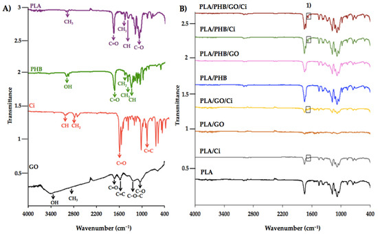 IR spectra of (A) PLA, PHB, Ci, GO and (B) blends and bionanocomposites. (1) Ci impregnation in films and blends.