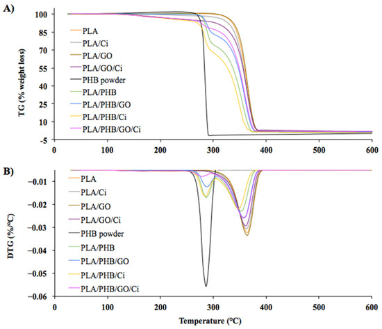 Due to its structure, GO has a potential action as an effective thermal barrier in the PLA matrix. The literature indicates that if there is a strong interfacial adhesion between the nanomaterial and the polymer, it could be possible to restrict the mobility of the chains by improving their thermal stability [68]. For this case, considering that there was a low peak displacement associated with the interaction between the carbonyl groups (see Figure 3B), it could be concluded that there is a lack of uniform dispersion or formation of aggregates, which allows stability in the degradation temperature [69]. For the case of the PLA/PHB blend (Figure 3B), two DTG were obtained between the first at 286.7 °C and the second at 350.8 °C, these values if compared with other studies of the same blend observing lower temperatures. This increase in the DTG can be explained due to a higher % w/w of PLA in the blend provoking higher thermal stability [21,70]. The low PHB thermal stability is due to the fact that it interacts with the amorphous phase of PLA through trans-esterification reactions [21], generating a negative effect on the stability of the materials in general. Considering this effect, when observing Figure 3B it is possible to appreciate two thermal degradation temperatures, associated with the respective polymers, showing that they are immiscible [70].