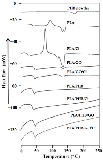 On the other hand, it is possible to observe that the incorporation of PHB to the PLA matrix did not generate a significant effect on Tg value, obtaining temperatures of 49, 50.7, and 50 °C for PLA/PHB, PLA/PHB/GO, and PLA/PHB/GO/Ci, respectively. However, there is a 5 °C decrease when Ci was incorporated into the PLA/PHB blend, similar values were obtained in the same blend when 20% lactic acid oligomers were incorporated, causing a plasticizer effect associated with the compound incorporation [11].