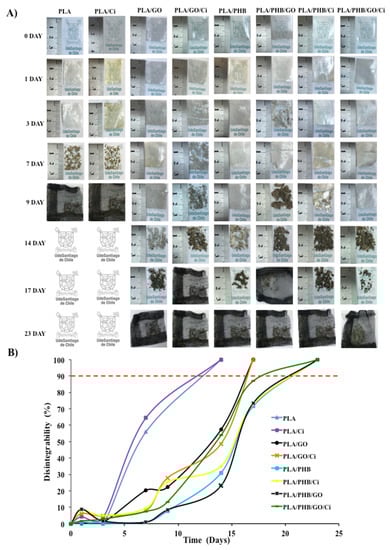 Figure 5A shows the visual evolution of the disintegration of the blends and bionanocomposites during the 23 days that the test lasted. From the results, it is possible to confirm the biodisintegrable character of all formulations under composting. After 1 day of incubation from the beginning of the degradation process, PLA films’ loss of transparency and became more opaque. This behavior is because of a change in the refraction index of the materials as a result of water absorption and/or the presence of products formed by the hydrolytic process [77]. After three days of incubation in a composting medium, PLA/PHB/GO films became breakable due to the increase in their chemical degradation, where the PHB delayed the disintegration rate of PLA in the compost. This result is associated with the blend increasing the hydrophobic character, which delays the polymer hydrolysis process required for the microorganisms from the compost to further disintegrate the polymeric matrix. However, this conclusion may be affected by the film’s immiscibility, previously established by means of thermal analysis. Although these can present chemical interactions associated with band displacement (see Section 3.1), with respect to their chemical groups, the heterogeneity of the material influences their degradation. Given this, the particular role of PHB as a polymer matrix can be considered, since it has been proven that it delays the PLA degradability at a temperature of 58 °C, due to its different mechanisms at the time of degradation [70,78].