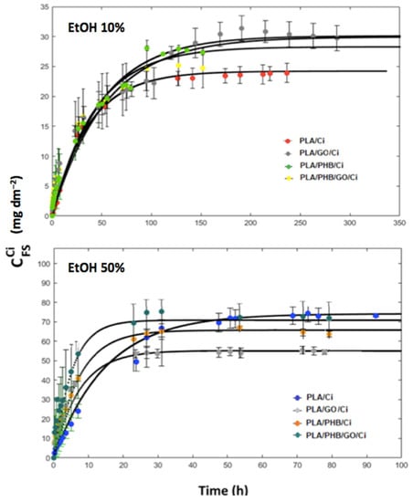 The Ci release kinetic study and mass transfer properties determination is focused on the final disposition and the applicability of the blends and bionanocomposites. It is also important to establish the concentration of Ci over time and the affinity it has in different mediums. The release of the active compound from films and blends with and without GO was carried out into 10% v/v and 50% v/v ethanolic solutions, according to European regulation [49] following the procedure described by Torres and coworkers (2014) [32]. Release experiments were conducted with the aim to study the transport and thermodynamic properties of the active compound in the developed materials. Impregnated film and blends samples with 50 cm2 surface area were totally immersed into glass tubes filled with 130 mL of ethanol solutions. Films were placed in the tubes using metal supports to avoid direct contact between samples and with the wall of the tube. These tubes were stored at 40 °C in an oven for at least 10 days. Ethanol simulant samples of 1 mL were collected from the tubes as a time function. These samples were analyzed by means of HPLC (see Section 2.5.1) to determine the concentration of release Ci as a time function. The analyses were performed in duplicate.