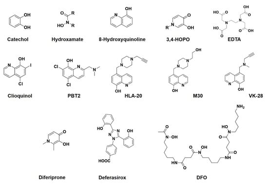 | 8-Hydroxyquinoline type | N,O | Clioquinol, PBT2, HLA20, M30, VK-28 | [18,19,20,21,22,23] |