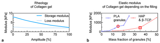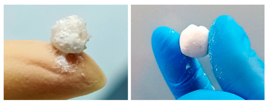 When comparing systems with the maximum filling before the material destruction, a highly porous PLA granules composition showed higher stress than a system with HAP/β-TCP granules. However, the filling of hydrogels with porous PLA granules increased their elastic modulus while maintaining elasticity. Additionally, the better moldable properties of composition with PLA granules were confirmed by visual and manipulative analysis. The composition did not stick to gloves. Rolled into a ball, it had smoother edges than the composition filled with HAP/β-TCP granules (Figure 2).