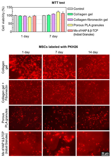 Cell adhesion was investigated using a fluorescent dye. For this, a cell suspension was prepared. MSC cells were removed from Petri dishes with a Versen solution (PanEko, Moscow, Russia) with 0.25% trypsin (PanEko, Moscow, Russia) and centrifuged at 1100 rpm for 10 min. Cells were stained with PKH-26 dye according to the manufacturer’s instructions (Sigma-Aldrich, St. Louis, MO, USA). After staining, the cells were precipitated by centrifugation. The concentration of cells in suspension was 1 × 106 per 1 mL of growth medium. The samples of materials were placed in 96-well plates (Thermo Fisher Scientific, Inc., Waltham, MA, USA). A total of 30 μL of the cell suspension in each well were added and incubated for 60 min under standard culture conditions. After, 1 mL of growth medium was carefully added. The cells were cultured on carriers for 7 days, with the growth medium changing every 3–4 days. Images of cells labeled with PKH26 on the material’s surface were obtained using an AxioObserver D1 inverted fluorescence microscope with an AxioCam HRc camera (Carl Zeiss, Oberkochen, Germany).
