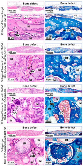Implantation of materials into rat critical-size calvarial defect. H&E (left column) and Masson (right column) staining. IM—Implanted material, CT—connective tissue, BV—blood vessel, NB—newly formed bone, GC—giant cells.