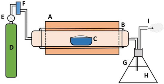 The schematic illustration of pyrolysis system setup: (A) electrical furnace, (B) ceramic tube, (C) alumina boat, (D) N2 gas cylinder, (E) gas regulator valve, (F) flow rate meter, (G) conical flask, (H) water, and (I) outlet gas.