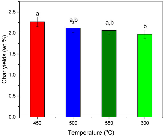 Char yields (wt.%) at different pyrolytic temperatures (°C). Take note that a,b values with different letters in the same column are significantly different (p < 0.05).