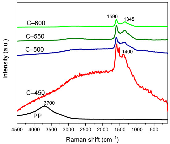 Raman spectroscopy and FTIR spectroscopy proved the vibrational spectrum by inelastic scattering and absorption, respectively, for polymer chains conformation [68]. In many cases, these two approaches complement each other. The Raman spectra of neat PP-IG samples was recorded as reference spectra for further study of PP-IG derived char with different elevated pyrolysis temperature, as shown in Figure 8. For pure PP-IG, an intense and broad peak was discovered at 3700 cm−1. A similar result had been observed by Bhattacharyya et al. [69] and Ahmad et al. [70]. According to the registered bands in the vibrational spectrum of PP [68], the peak that arose within the Raman frequency range of 2900 to 3700 cm−1 was ascribed to the vibrations due to asymmetrical –CH, –CH2, and –CH3 functional groups. Thus, this result supported the discoveries of the methane, methyl, and methylene groups within the structure of the raw PP-IG samples (refer to Figure 8).
