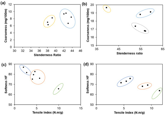 Coarseness as a function of slenderness ratio of hardwood (a) and softwood (b) fiber pulps, as well as softness HF as a function of tensile index properties of hardwood (c) and softwood (d) fiber pulps.