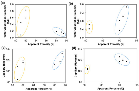 Water absorption capacity as function of apparent porosity of hardwood (a) and softwood (b) fiber pulps, as well as capillary rise as function of apparent porosity of hardwood (c) and softwood (d) fiber pulps.
