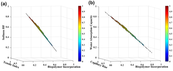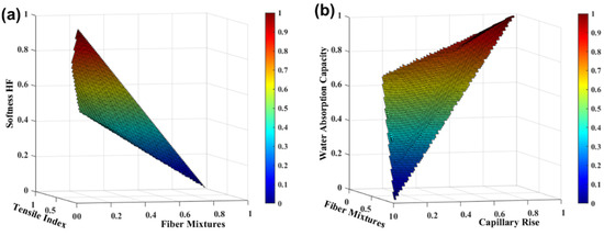 A blend of hardwood pulps with a percentage of softwood pulps is used to produce these materials. The softwood fibers ensure the fibrous structure strength and runnability to the tissue paper machine; however, these fibers present a high cost in tissue production. Therefore, it is essential to find effective strategies for removing or replacing these fibers in the production of these products. In our work, we investigated mixtures of eucalyptus fiber and softwood reinforcement fiber in ratios of 100:0, 99:1, 95:5, 90:10, and 75:25. The experimental results indicated that the strength properties were increased from 93 to 303% and the properties of softness, water absorption capacity, and capillary rise were decreased from 28 to 8%, 7 to 1%, and 7 to 2%, respectively [17]. The SimTissue allows us to predict a wide range of scenario variability by quantifying the influence of incorporating other percentages of reinforcement fibers that have not been studied experimentally. The ideal ranges for tissue properties were obtained simultaneously through computational simulation to identify different combinations of fiber percentages. All these computational combinations allow covering a much larger results area, which would not be possible using only experimental results, with the time and resources they require [17]. Figure 3 presents the functional properties of tissue products as a function of fiber mixtures, obtained with the SimTissue prediction. For the studies, we considered the softwood maximum incorporation of 30%, as tissue papers are produced in this range. Higher softness values correspond to lower tensile index values. This trend varies with the fiber mixture, where the normalized variable 0 corresponds to a formulation with 100% eucalyptus pulp, and the normalized variable 1 corresponds to a formulation with 70% eucalyptus pulp and 30% softwood fibers, the reasonable maximum incorporation to produce tissue papers.
