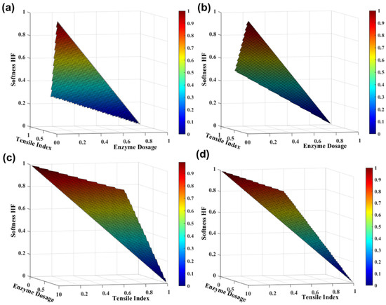 TSA softness HF and tensile index properties with enzyme dosages in eucalyptus kraft pulp (a,b) and eucalyptus sulfite pulp (c,d) for 30 min (a,c) and 60 min (b,d). The variables were normalized.