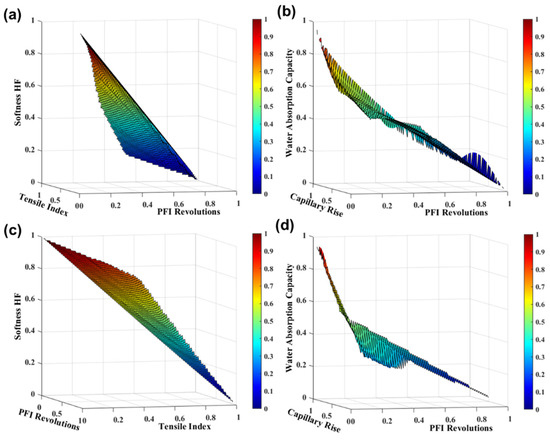 TSA-softness HF and tensile index properties (a,c) and water absorption capacity and capillary rise (b,d) with PFI revolutions at 3.33 N/mm (a,b) and 1.67 N/mm (c,d). The variables were normalized.