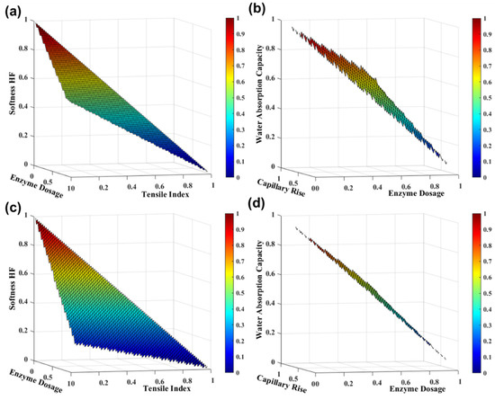 TSA-softness HF and tensile index properties (a,c) and water absorption capacity and capillary rise (b,d) with enzyme dosage in an enzymatic pretreatment process followed by 500 PFI revolutions at 3.33 N/mm (a,b) and pre-refining at 500 PFI revolutions at 3.33 N/mm, followed by enzymatic treatment (c,d). The variables were normalized.