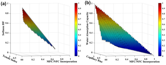 TSA-softness HF softness and tensile index properties (a) and water absorption capacity and capillary rise (b) with MFC/NFC incorporation in a eucalyptus slush pulp. The variables were normalized.