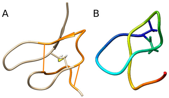 During the last 30 years, though not expected, more entangled structures have constantly been discovered. The most well-known examples include knotted [1,2] or slipknotted [3,4] proteins, links [5,6], and chain mail structures of bacteriofag capsid [7]. In 2019, -curves were found [8]. In the 1990s, two other complex structures were discovered—cysteine knots [9,10,11,12,13] and lasso peptides (or lariat protoknots) [14,15,16,17,18,19]. To avoid confusion, throughout this paper, we call these miniproteins. Both types have proven therapeutic significance [11,20,21], both featuring the presence of at least one covalent loop (formed by the main chain closed by an amide or disulfide bridge), which is pierced by some portion of the chain or its bridge (see Figure 1). Moreover, some cysteine knots and miniproteins fulfill a similar function.