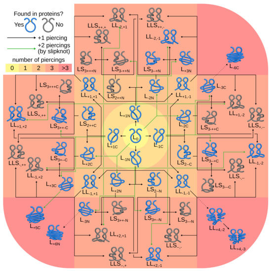 To answer this question, we searched for (evolution-based) PFAM families containing structures with different lasso types, gathered together in the same (evolution-based) PFAM clan. Co-ocurence of different lasso types in one PFAM clan is a clue that such structures could evolve from the same ancestor. As a result, we found several pairs of lasso motifs joined by membership in the same clan. All possibly evolutionarily important connections (like ) are depicted in Figure 2. Interestingly, there 5 proteins were identified which, depending on their structures, had different topologies: or (, and ). This proves that the triply pierced proteins may have evolved from singly pierced ones by adding two piercings “at once”, i.e., the slipknot conformation, known from knotted protein folding [48].