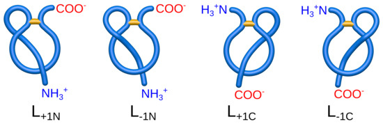 By taking into account the piercing direction and the type of piercing tail (N-end or C-end), the major lasso type can be split into smaller (minor) subtypes. For example, the type is composed of four subtypes (, , , ), with the direction of piercing described by a + or − sign and the crossing tail denoted by a capital N or C (Figure 3). For further details concerning the naming convention, see the Supplementary Materials.