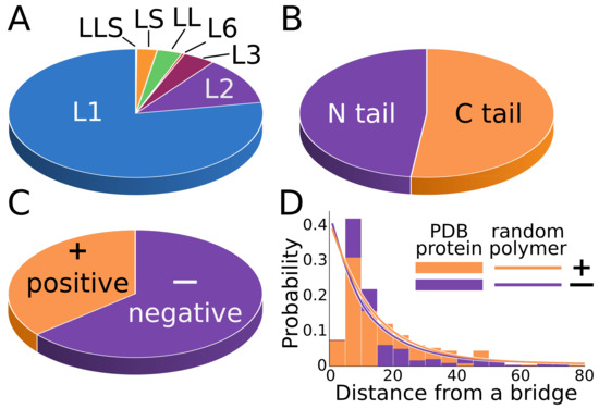 Statistics of loop-type ocurence among the non-redundant set of proteins. The pie charts present (A) major types, (B) piercing tails, and (C) the piercing direction. In (B,C), all lassos except the two-sided () class are taken into account. (D) Histogram of the sequential distance between the bridge and the nearest piercing with distinction of the positive (+) and negative (−) piercings. Curves represent the theoretical prediction for a random polymer (based on the fit of the simulated data in [27]).