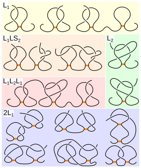 Although the lasso fingerprint is easy to construct and contains a lot of information characterizing the chain topology (e.g., number of pierced loops, their sequential order, etc), it does not characterize the chain topology unequivocally. Observe, for example, that there are over 20 different structures that could be categorized as the lasso fingerprint (some of them are shown in Figure 5). The development of an easy method for unequivocal multiple lasso classification could be a challenge for mathematicians but has potential importance in biology. Note that, in particular, the fingerprint can denote the linked covalent loops (forming a Hopf link—Figure 5, bottom right panel). Such structures possessing interesting properties that were identified in [22,28].