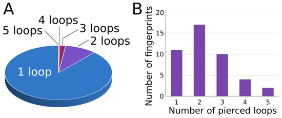 Distribution of pierced loops and lasso fingerprints in lasso proteins. (A) Number of pierced loops in a single chain. (B) Number of different lasso fingerprints depending on the number of pierced loops.