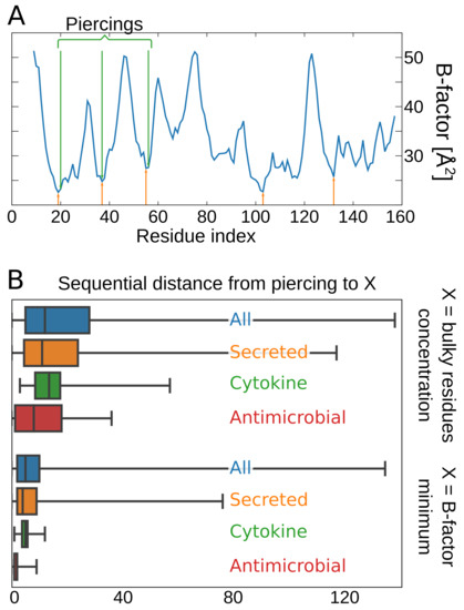Secondly, the highly stable parts of a protein should be characterized by a low B-factor in the case of a crystal structure. In the case of an NMR structure, the analog of the B-factor can be the mean square deviation of positions of atoms in different models (for details, see the Supplementary Materials). We, therefore, identified the minima of the B-factor (or mean square deviation) and, similarly to the previous approach, we calculated the sequential distance between the piercing and the (sequentially) closest minimum. Again, the stabilized piercing should be characterized by a low distance compared with the average. This approach is further supported by the fact that, in many cases, the location of the piercing correlates well with the location of the calculated minimum of the B-factor [47], e.g., for lipocalin with PDB code 1A3Y (see Figure 8A). To determine the loop sizes for which the effect is still visible, we plotted both average distances (from the maximum of bulky residues concentration and minimum of B-factor)—Figure 8B. To determine the possible importance of each class, we also compared the average for all proteins with average values for secreted antimicrobial and cytokines with the lasso type.