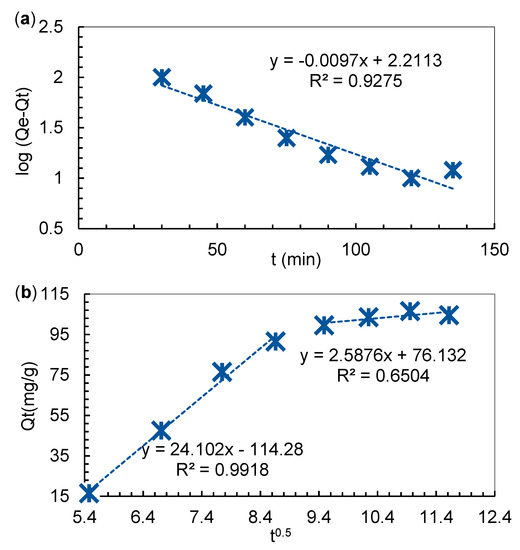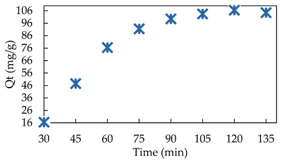 The behavior of the reaction rate can be analyzed using kinetic adsorption models. The kinetic trend was determined by fitting the adsorption capacity (Qt) vs. the adsorption time (t) in Figure 1. From this investigation, Qt was calculated with the following equation (eq):