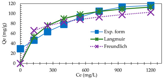 where: Kf and n represent adsorption capacity and intensity for IRA 402(Cl−), respectively. Thus, by graphical representation of the lnQe vs. lnCe, the values and lnKf from the slope and intercept were calculated by the linear regression equation y = 0.1954 x + 3.2477 as follows: Kf = 25.7 mg/g, n = 5.12 and = 0.2 (see Table 3). Additionally, is less than 1, representing a measure of adsorption process probability. The R2 value of 0.8614 suggests that this model is less adequate in describing the adsorption equilibrium data of AB 113 onto IRA 402(Cl−) when compared with the R2 obtained using the Langmuir model. A comparison of theoretical models with the experimental data is presented in Figure 4.