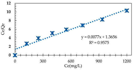 In general, adsorption study is modeled with isotherms described by mathematical equations. Isotherm studies are useful to detect the concentrations ratio of AB 113 between solid and liquid phases and to provide important information about those, when equilibrium is reached [35]. Thus, the adsorption process of AB 113 onto IRA 402(Cl−) resin, applying the Langmuir and Freundlich isotherm model, was evaluated. The Langmuir isotherm describes the quantitative adsorption of AB 113 on homogeneous surface of the IRA 402(Cl−) resin and was modulated using the following Equation: