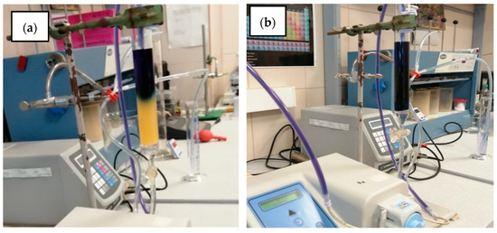 Pilot continuous mode adsorption installation at the National Research and Development Institute for Industrial Ecology (ECOIND) laboratory: (a) loaded bed column after 174 h of continuous solution flow; (b) loaded bed column after 348 h of continuous solution flow of AB 113.