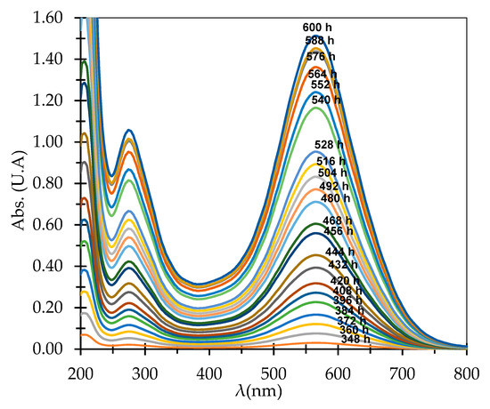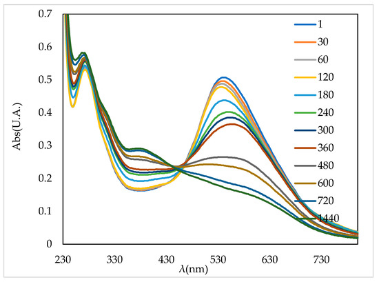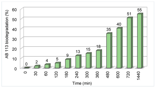 Modern depollution technology should follow sustainable development requirements. Thus, biotechnologies based on using microbes or enzymes are an important evolving field. In our previous study [16] it was observed that the best gryphalan navy blue A193 azo dye enzymatic degradation was obtained at pH = 4. Considering this result, the laccase biodegradation of AB 113 was evaluated only at pH = 4. The biodegradation efficiency was calculated by monitoring the surface area of UV-VIS spectrum in the 450–750 nm range between 1 to 1440 min compared to the control containing dye AB 113 without laccase (Figure 10). During the experimental study the biodegradation rate increased up to 35% in 8 h of incubation, reaching a maximum degradation at 24 h when more than 55% of the 0.00003 M AB 113 concentration was bio-degraded (Figure 11).